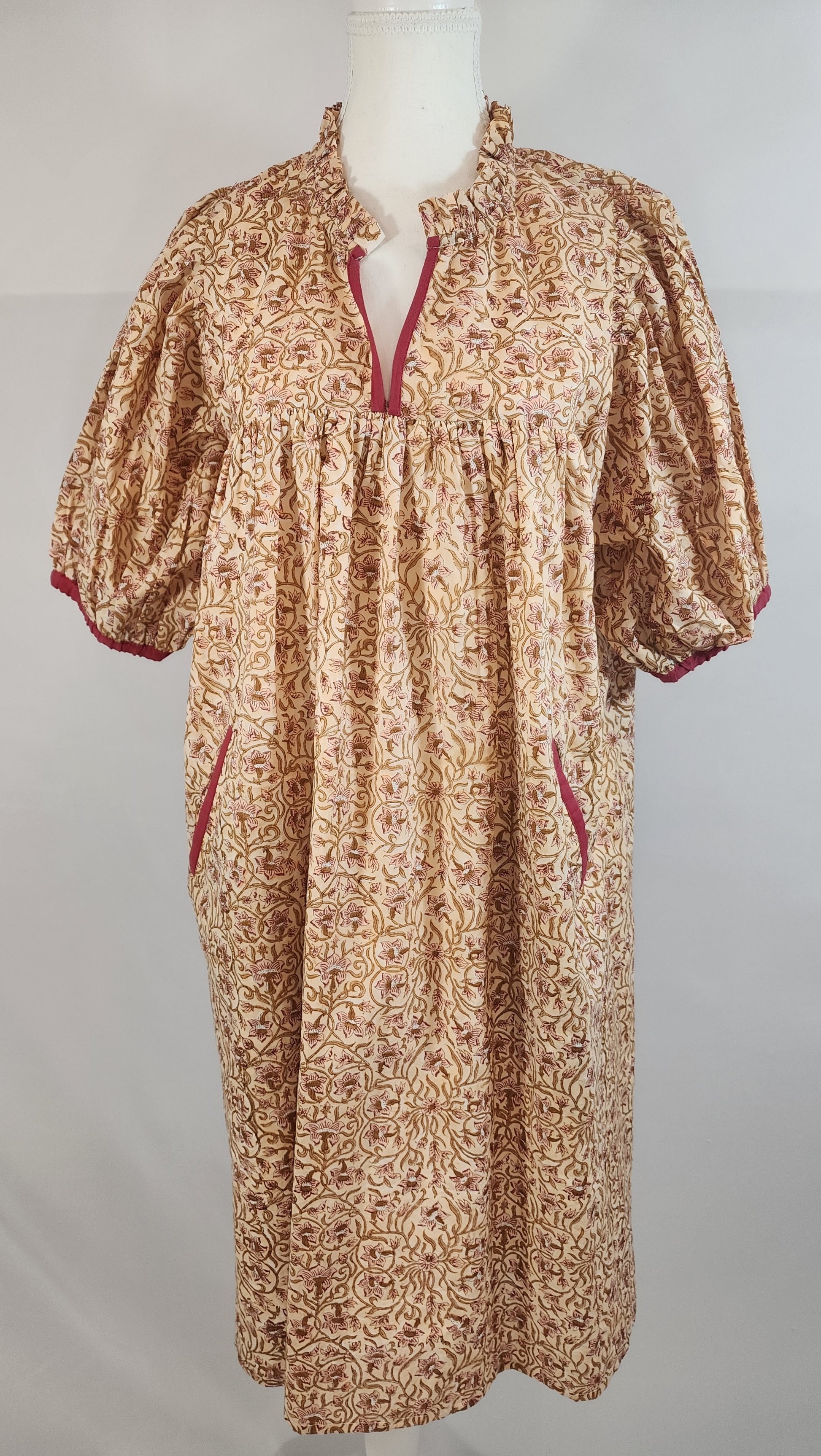 MUSTARD YELLOW/RED PRINTED DRESS WITH CONTRAST TRIM FABRIC DETAILS AND WITH POCKETS